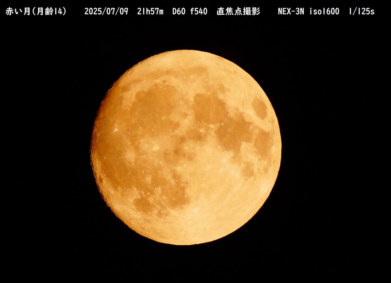 | 東の空を見るとまるで月食のような赤い月が上っていた。小型の屈折経緯台に小型のミラーレス一眼を取り付けて一コマ撮影するのは本当にお手軽だ |