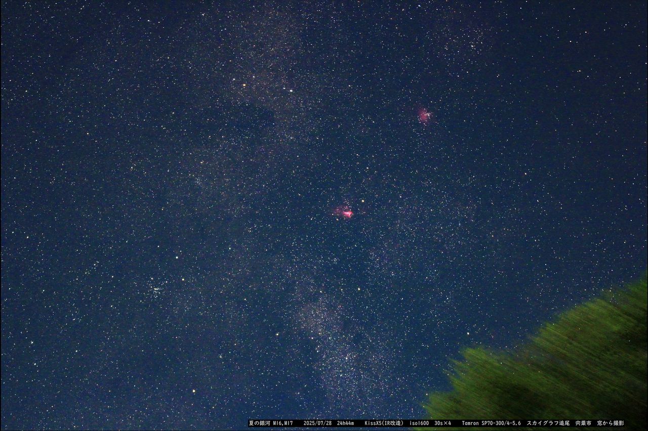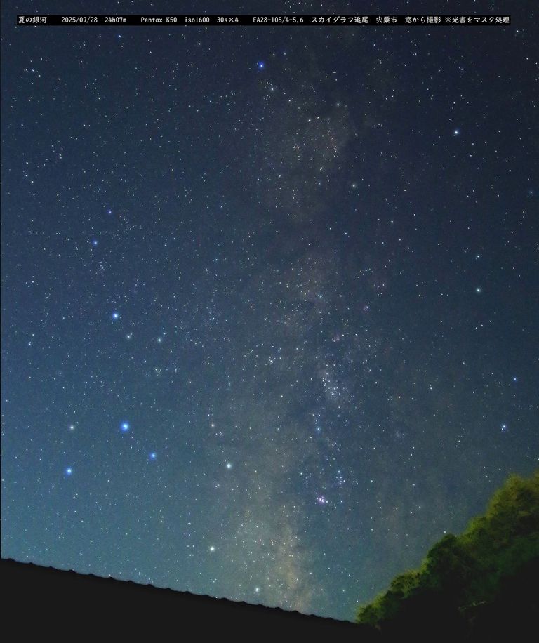 | この日は薄雲があって撮影は諦め双眼鏡でちょこと星見をしただけで寝たのですが,夜中に気になってカーテンを開けると天の川が見えてました。慌ててカメラをセットして30秒露出を4コマ・・全くの露出不足でした。最初にセットした小さなポタ赤は不慣れなためか極端な追尾不良で,安心・安定ののスカイグラフを窓際に立てて窓を開けカーテンで虫を遮断して撮影。※ベランダに出るには蚊よけ対策が必要になるので面倒だし冷房の効いた部屋から撮影が楽ちんである。 |