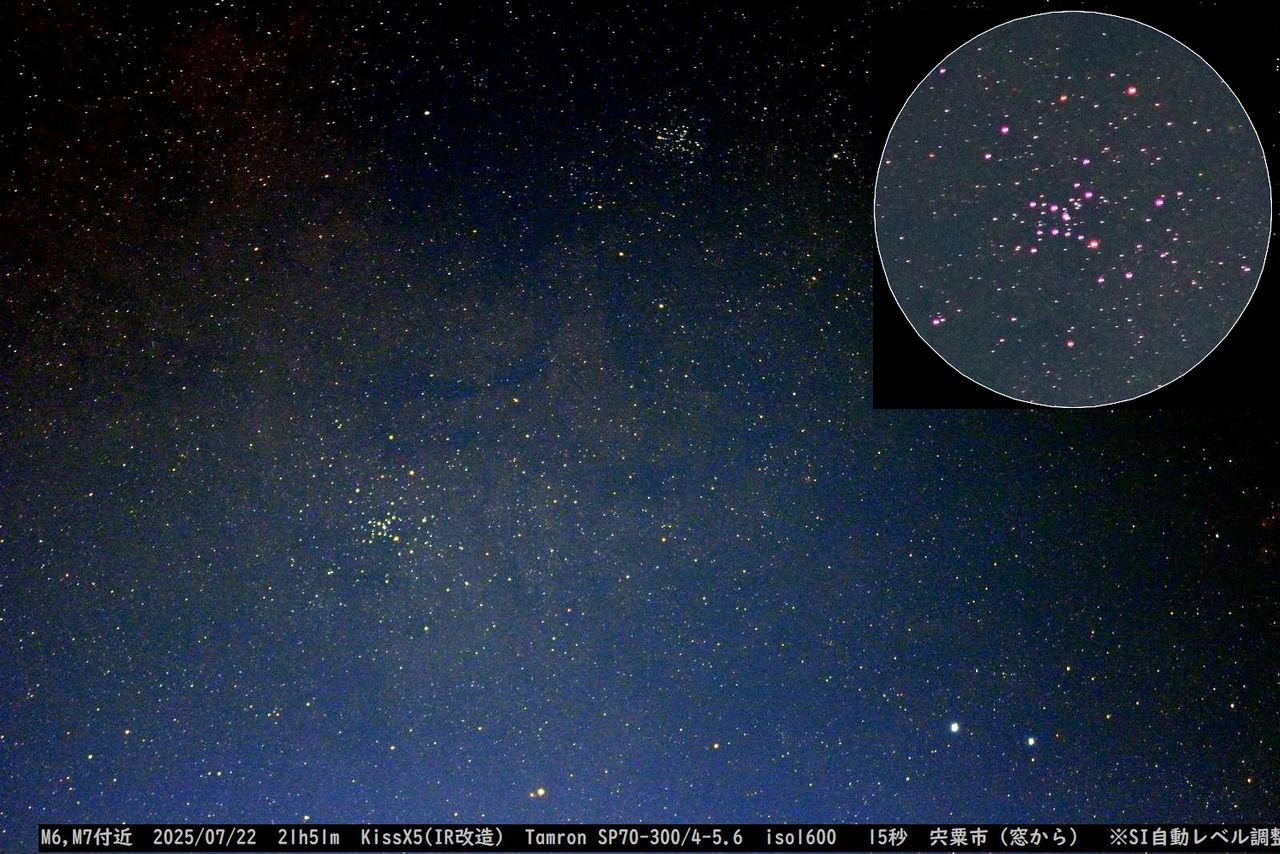 2025年,「この夏の星を見る」という映画がヒットしているようです。しかし実際の星空に関しては この夏に限らず夜になると薄雲が拡がり星を見ることができる日は年々少なくなっています。 双眼鏡を使って夏の天の川を眺めることが出来るのは週に一回あれば良い方でしょうか? この夏のある日(2025/08/21),双眼鏡とナイトビジョンを対決させる絶好の天気でした。 南の窓から覗くと肉眼では星が全く見えません。10x50双眼鏡でいて座の形はわかります。 しかし,M22は見えません。M8も見つからない・・ずっーと高度を上げてM11はなんとなく 分かります。この辺りは少し雲が薄いようです。次にナイトビジョンPJ2-0532を向けてみると 見える,見える!M22はデカいし,M8はモヤッとM25は星の並びも,M7も山の稜線ギリギリに これだけ見えると,今まで諦めていた薄雲がある日にも星空観望が出来る。ただ,荒れた 写真のようで綺麗ではないが存在は確認できる。これからの天体観望は双眼鏡よりも ナイトビジョンを持ち出す日が多くなりそうである。どこかのホームページで見たが,住宅地での 星空観望では口径12センチの双眼鏡よりも防犯カメラの方がよく見えるとあった。ゆる天☆ テレビで星空鑑賞