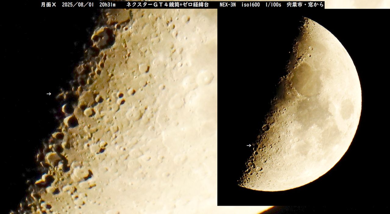| 今日は月面Xの日・・夕方おもちゃ望遠鏡の見比べをやってて思い出した。撮影後,レンズに乾燥剤が貼り付いてたのを見て失敗と思ったが,なんとか写ってました。