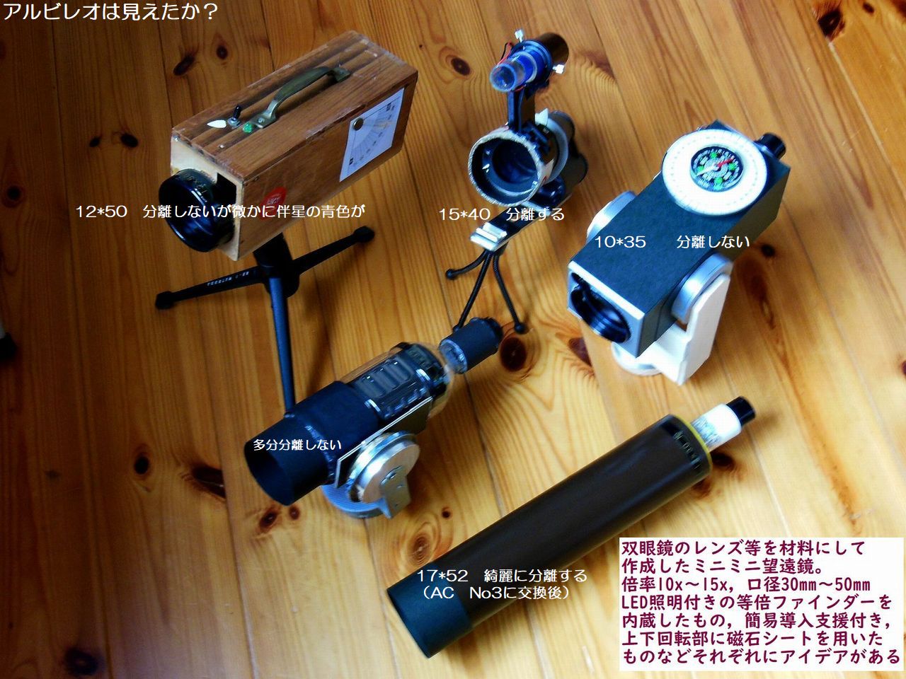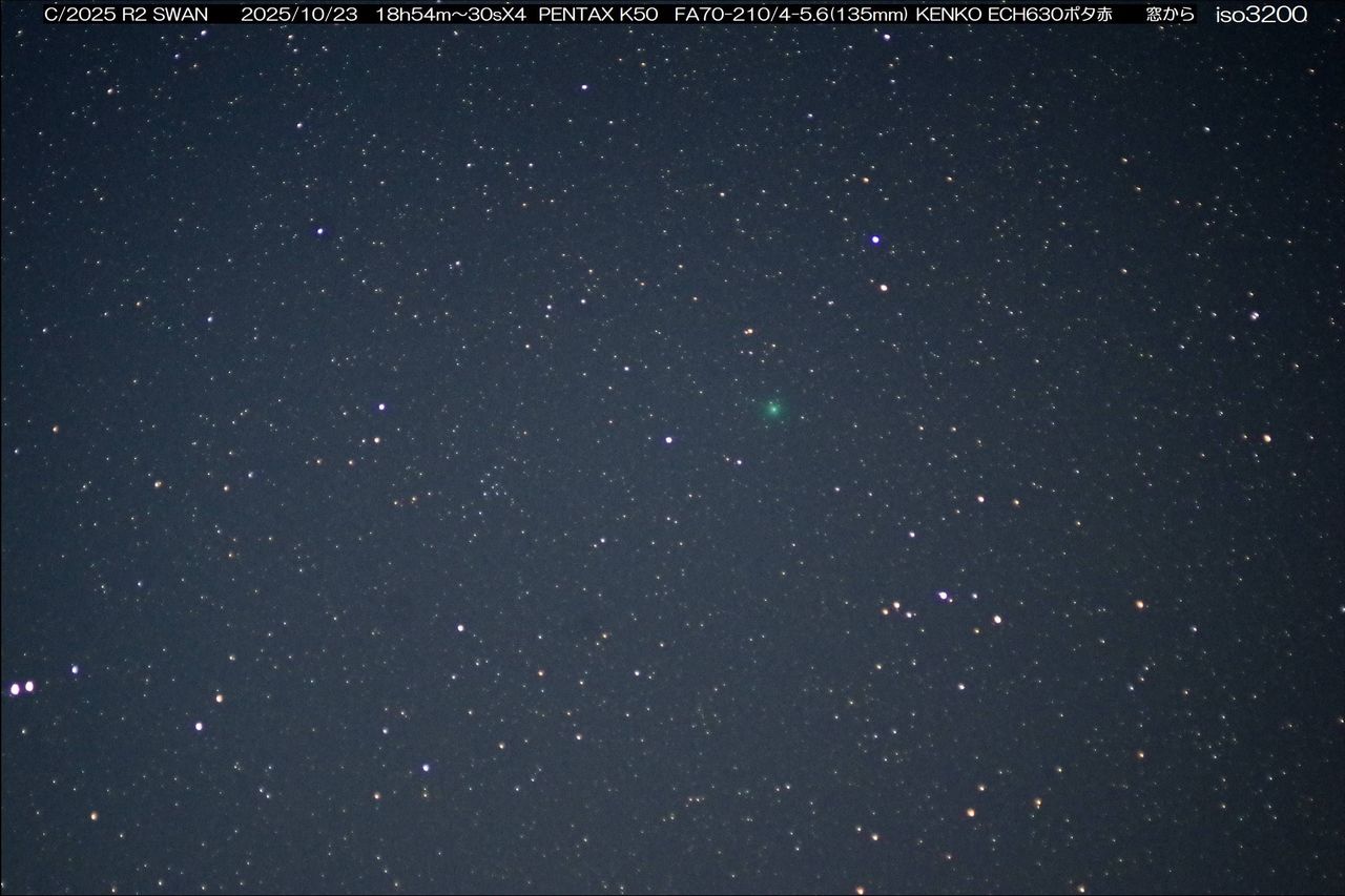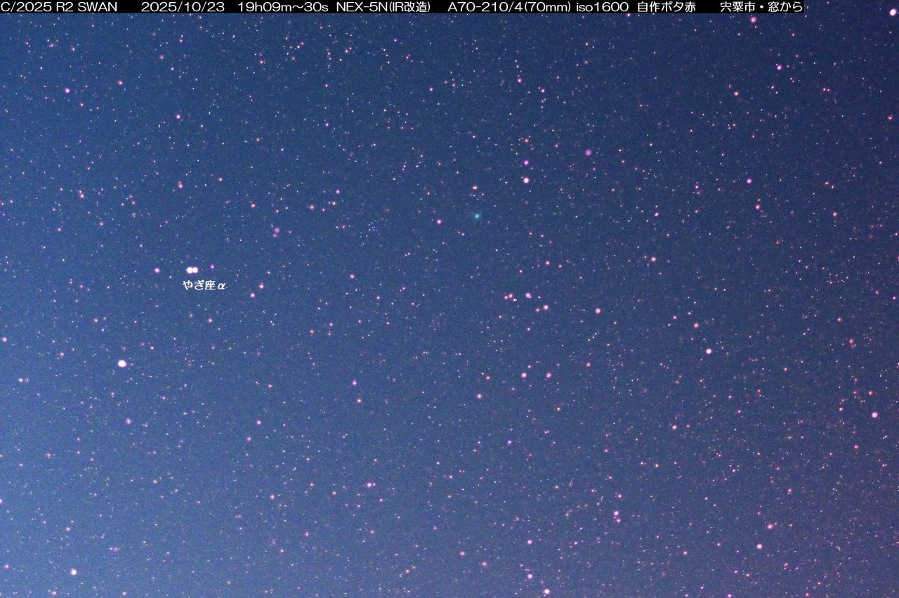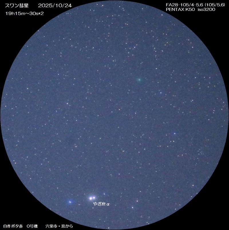 | レモン彗星に続きスワン彗星も撮影できた。こちらは自宅窓から楽々見える高度なので各種カメラで比較してみた。位置はやぎ座αから西に10度ほどであり,15*45IS双眼鏡ですぐに見つかった。大きいがレモン彗星と違って淡く拡散しており8*30双眼鏡では気付かないほど。F5.6の暗いレンズだとiso1600では全くといっていい程暗い画像である。iso3200にすると問題ない。20x50自作テレスコで探すもステラナビゲータの目盛りを読み違い10度高い位置を探していた・・何度も鏡筒を振ってみてもやぎ座αさえ導入出来ず諦めていたがステナビの読み間違いと分かりすぐに導入できた。45度プリズムを使う場合はそれなりのファインダーが必要だと感じた。20x50で彗星はよく見えた。15*45程ではないが低倍率の双眼鏡とは比較にならない。その他の自作おもちゃ望遠鏡も試したかったが倒立像では双眼鏡で見たイメージ(正立像)からの導入は難しいと感じた。15X40単眼鏡でも見えた |