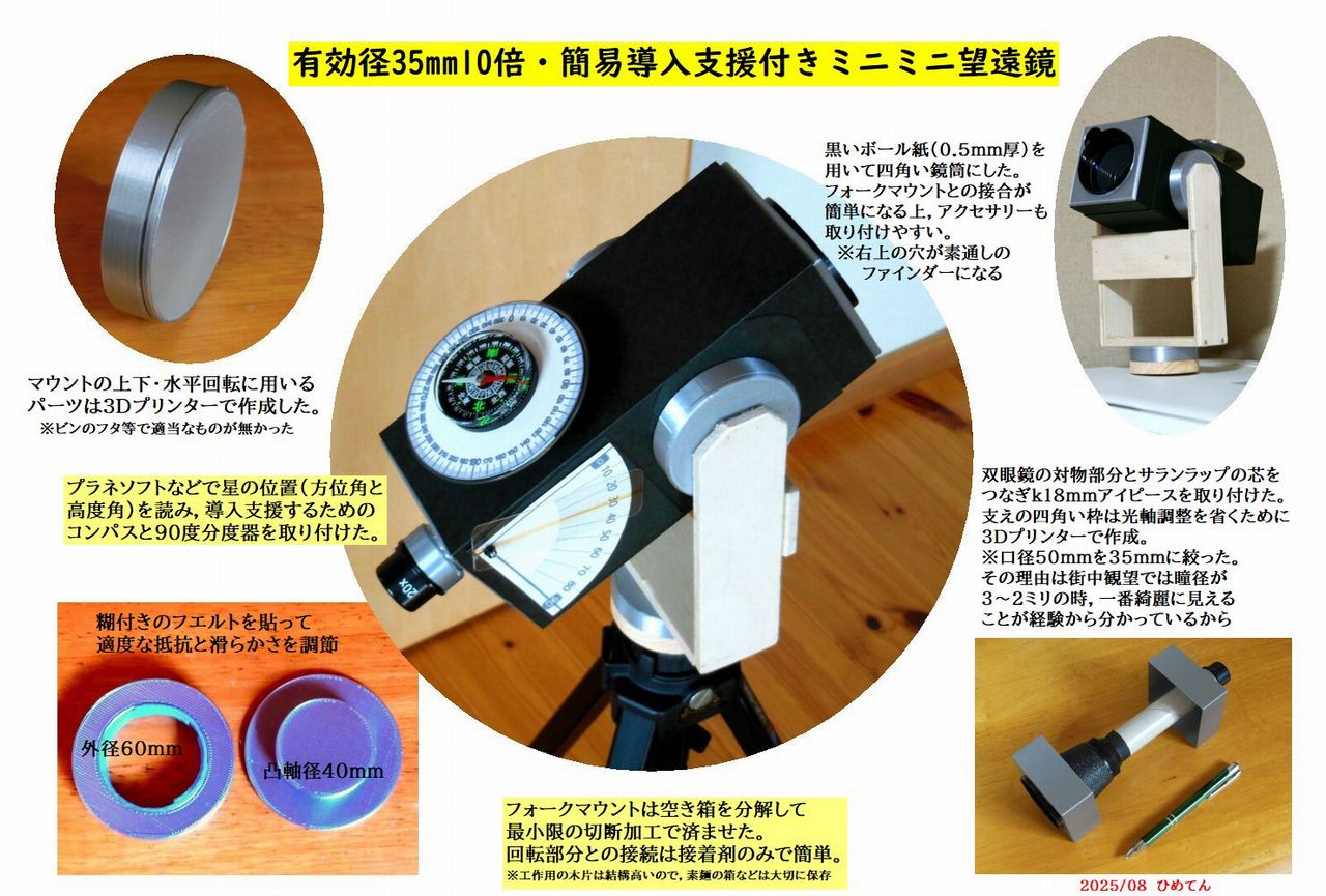 | 窓からチョコっと星見をする望遠鏡です。見たい星を探す手間を省く[方位・高度]による導入支援は初心者には必須かも・・具体例はこちら |