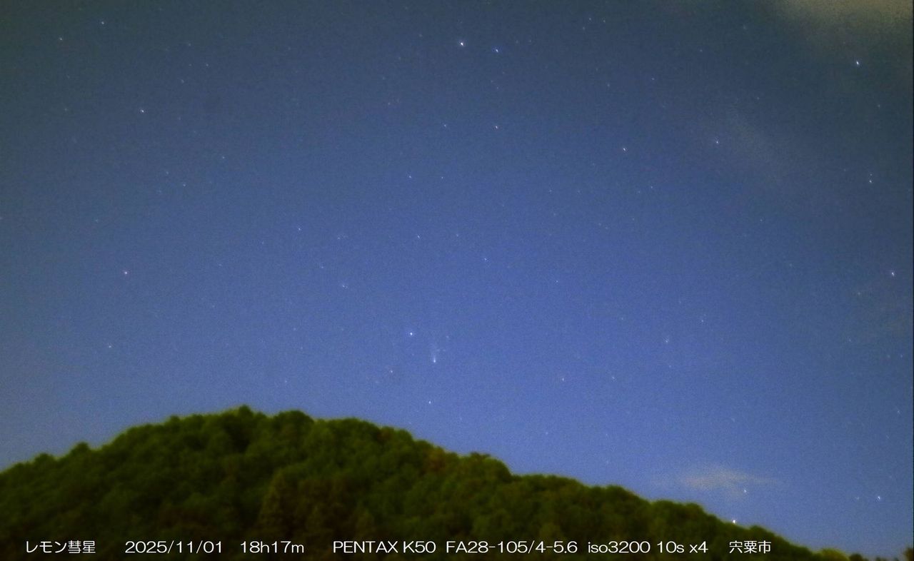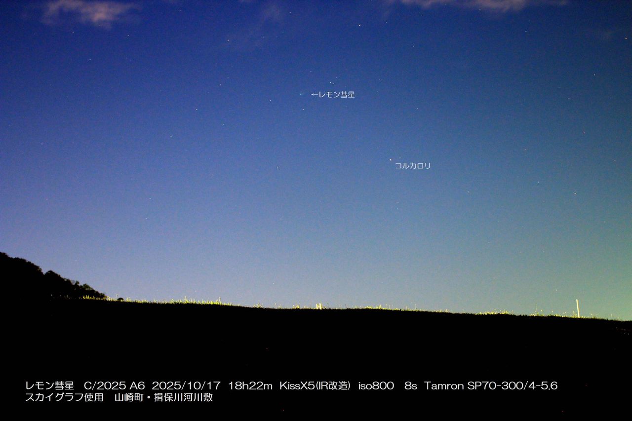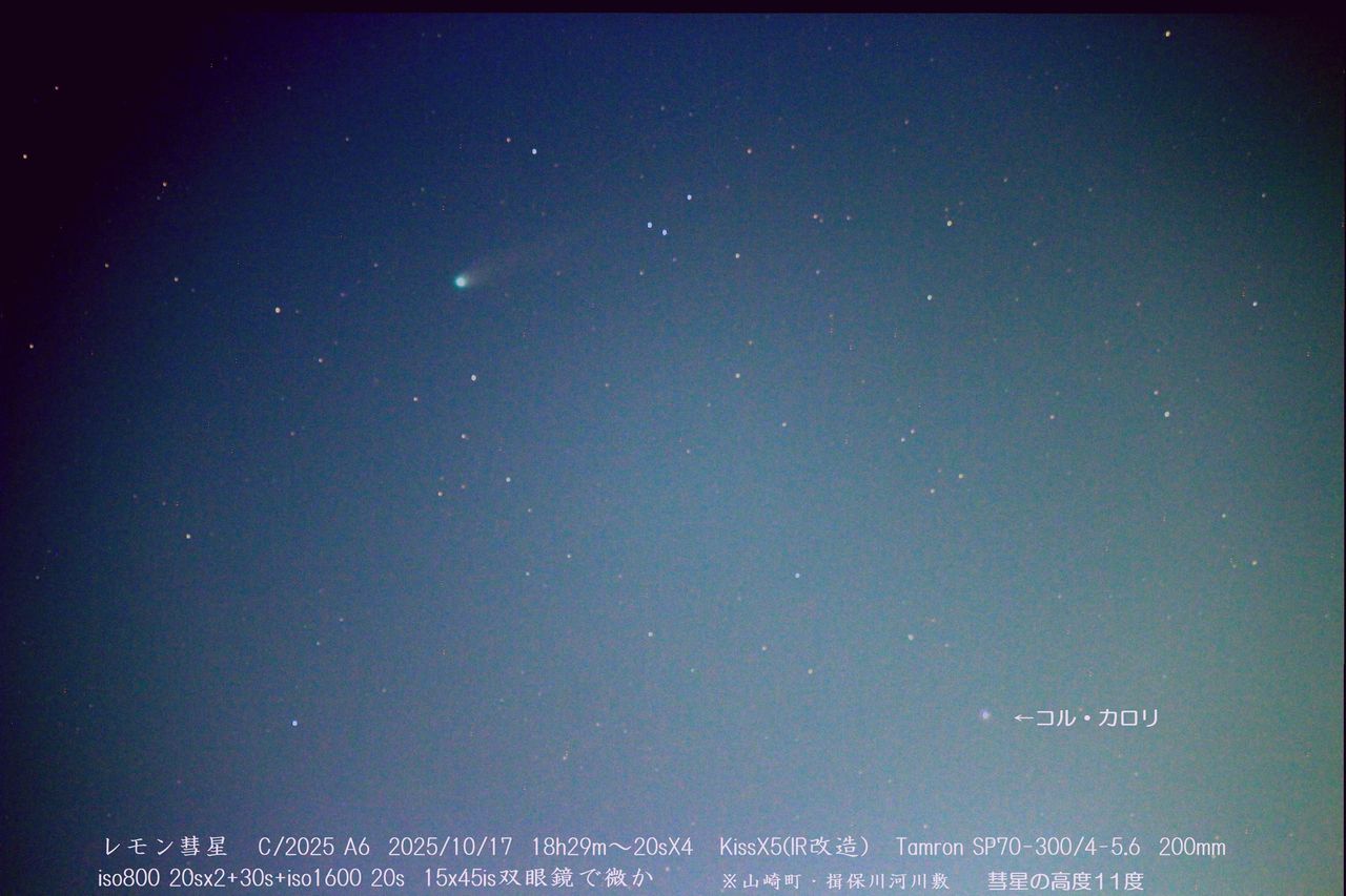 C/2025 A6 Lemmon やっと晴れたので揖保川河川敷までレモン彗星を見に行く。彗星の高度は11度ほど。双眼鏡では位置が分からず,カメラで撮影して検出 |
