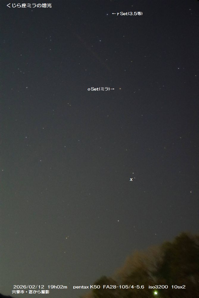 ミラが増光しているので,1月から何度か見ているが天候が悪くて撮影のチャンスが無かった。今日も(2026/02/12)双眼鏡でなんとか見える状況だったので固定カメラで撮影してみた。ワイドビノでは全く見えない薄曇り状態・・iso3200のざらつきを消すために10秒露出を二枚重ねている。 くじら座のχ(4.7等)という星にちょっと暗い星(6.8等)がくっついている。双眼鏡向きの二重星です。下の画像は28-105レンズの35mmで撮ってますが,元画像を拡大すると写っています。8x30双眼鏡でも,ミニ望遠鏡でも見えますが,さすがに単レンズ望遠鏡では無理でした。