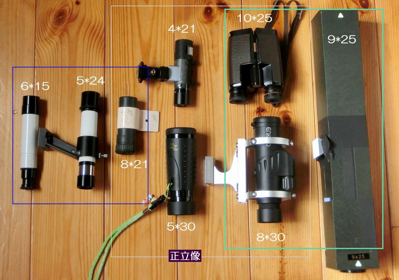 8*30単眼鏡は性能が良くて二台も買ってしまった機種でコントラスト良くシャープでよく見える。見かけ視野も広く気持ち良い。緑枠内の3機種はファインダー以上に星空を楽しめる。ここまでは順当・・これからが面白い結果になりました。4x21と5x30が同じ程度の見え方であったこと・・口径の差は感じません,ともに瞳径は5mm程と大きめで低倍率・広視野でファインダー向きの性能です。4x21は既製品の8x21単眼鏡のアイピースをK20に交換して正立像のまま実視野9°に改造したもの。よく見えます。 青枠内の3機種は小型であるが,右側に並んでいるものと比較して見えが悪く,ファインダーとして無いよりもマシと思えるもの。6x15としているものは,通常6x24と表示して販売されているファインダーです。対物レンズ直後の絞りによって有効口径は15mm程度になってます。瞳径も2mm程でファインダーとしては暗くて使い難い。実視野5°程で接眼レンズの見掛視野が極めて狭い(30°?)を考えればそんなものかと。5x24は昔のケンコーの望遠鏡に付いていた金属製の標準的なものです。瞳径は5mm程あるのに見え方は6x15と大差ないという不思議・・いや確かに明るいのだが見える星数は差がない。視野の広さも差がない・・ということは安いモノでええやん!となる。※古いものなので曇りがあり 青枠の3機種を昼間の景色で比較すると6x15が一番コントラストが良くシャープでもある。しかし星空に向けると全く違って8x21が一番マシだった。総合的な判断としては自作の4x21,実視野9°がファインダーとして使いやすいものだった。ダハプリズムの影響で暗くなるので瞳径は5mmあっても視野が明る過ぎず,丁度いい具合。 理想の小型ファインダーは,瞳径4mm前後,実視野8°以上,それに正立像となる。えっ,口径は?倍率は?これは逆算になります。見掛け視野60°の接眼レンズを用いたなら60➗️8=7.5(倍) 次に,対物口径 4x7.5=30(mm) おや,これは愛用している8x30単眼鏡に相当しますね。自作の4x21はどうでしょうか?瞳径5mm,実視野9°そして正立像・・全ての条件を満たしています。青枠のものは二機種が倒立像であり不可です。それに瞳径も小さいですし実視野が5〜6°しかありません。 ※なぜ正立像に拘るかというと,双眼鏡で目標天体付近を見たイメージをそのままファインダーでも見たいからです。