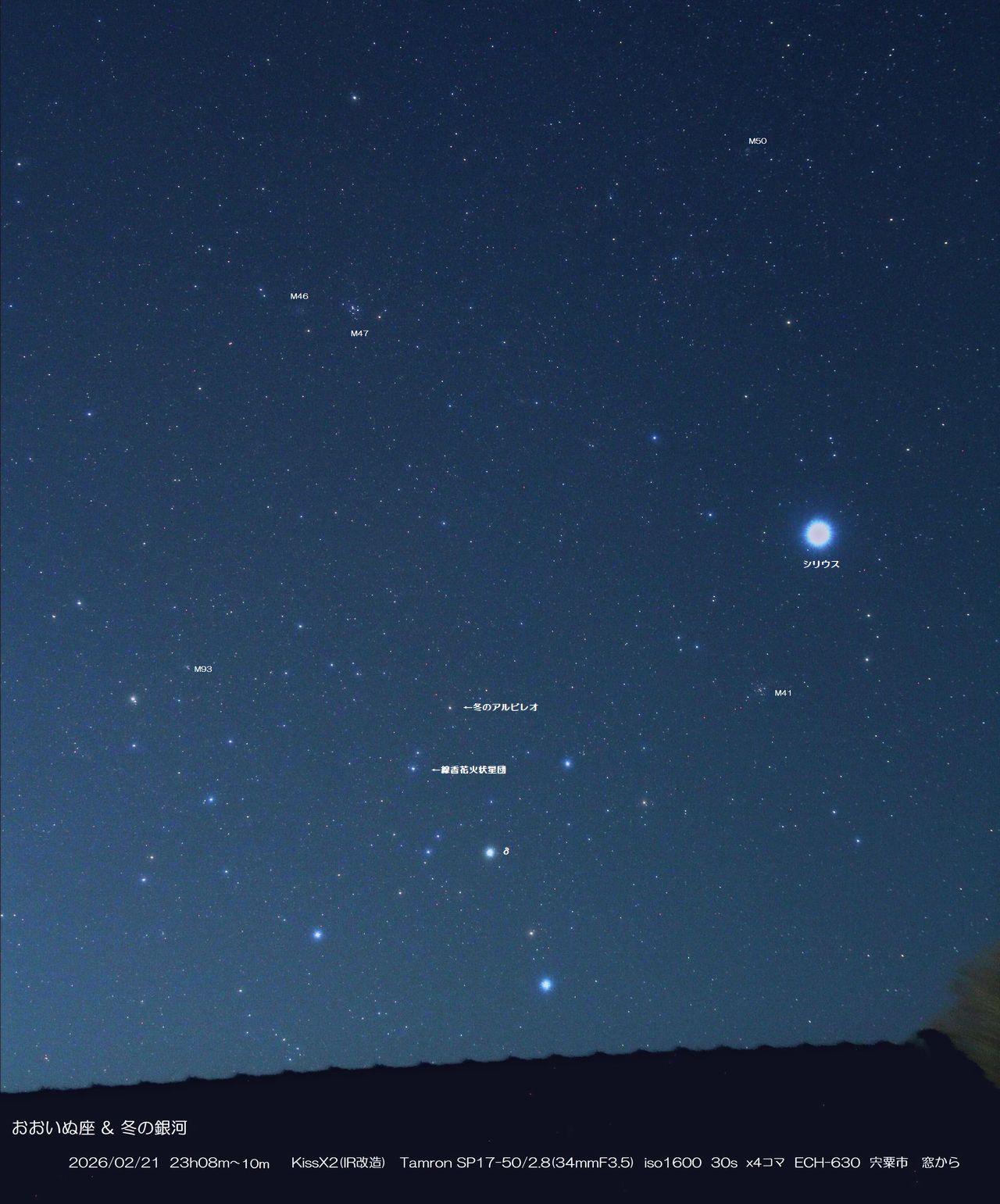 窓から撮影したおおいぬ座付近 冬の銀河が流れており星数も多い場所ですが2分露出だと銀河という感じはしませなん。印を付けたM天体はミニ望遠鏡の観望対象になります。ただしM46だけは口径5センチでは全く見えません。口径10cm・中倍率で微光星が集まった様子がわかります。冬のアルビレオも5cm20倍で見えます。線香花火状星団は8cmあればτ星を取り囲む微光星が見えてきます。5cmだと恒星を滲ませた感じに見えます。ミニ望遠鏡で楽しめるのはδ星を囲む半円形の星の並びです,いつもここを真っ先に探します・・ |