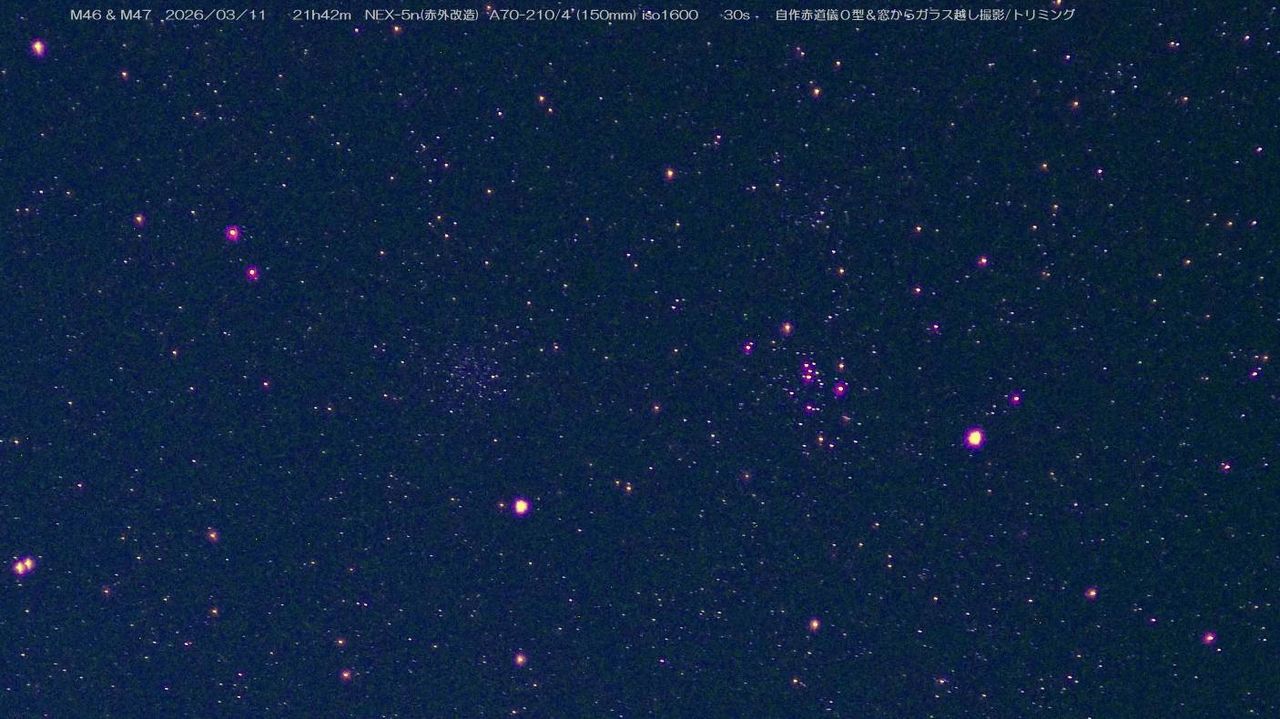 窓ガラス越しに撮影した M46 & M47 です 今までに撮影したM46&47の画像のリンクは以下にあります。 1.28-200という高倍率ズームで撮影。20年前です・・今のレンズだともっと写るでしょう 2.タカハシP型(D65mmf500mmセミアポ)で直焦点撮影 3.ミノルタMC300/4.5 古いレンズにしてはにシャープで微光星がよく写っている 4.ニコン300/4.5ED,FS102(D102mmf820mm)直焦点撮影。さすがに切れが良い。惑星状星雲も写っている 下の画像・・窓ガラス越しでもこれだけ写るということ(上記4点の撮影は屋外で),30秒露出でも結構暗い星まで写ること,古いズームレンズでも実用になること,準備から撮影まであっという間に終わること,全く疲れないということ等々メリットが多い。天候の変化しやすい現状の星見に適しているような気がする。大きい窓だと高度角50°付近まで撮影可能・・ただしガラス越しだと歪みがでる。ペアガラスだとシリウスなどはゴーストが出る。 窓から撮影の場合,天体の導入方法は方位角と高度角を利用して設定してます。※スマホのアプリが便利 |