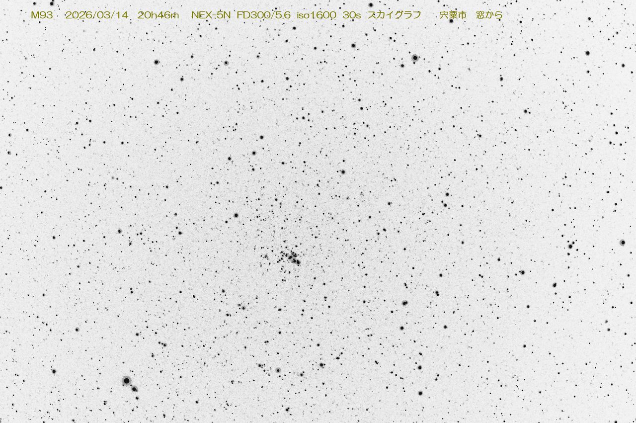 | 上記のミルトルを使って撮影。M93の導入はデジタル角度計とコンパス(南中時)で行って,見るアダプター(24倍)で確認をしたところ,ボンヤリしたものが視野のほぼ中央に入ってました。そらし目でも星は見えません。綺麗な画像ではなかったのでモノクロ反転して,30秒露出でもこれだけ写るというのを確認できるようにしました。10等級は写っていると思います。 |