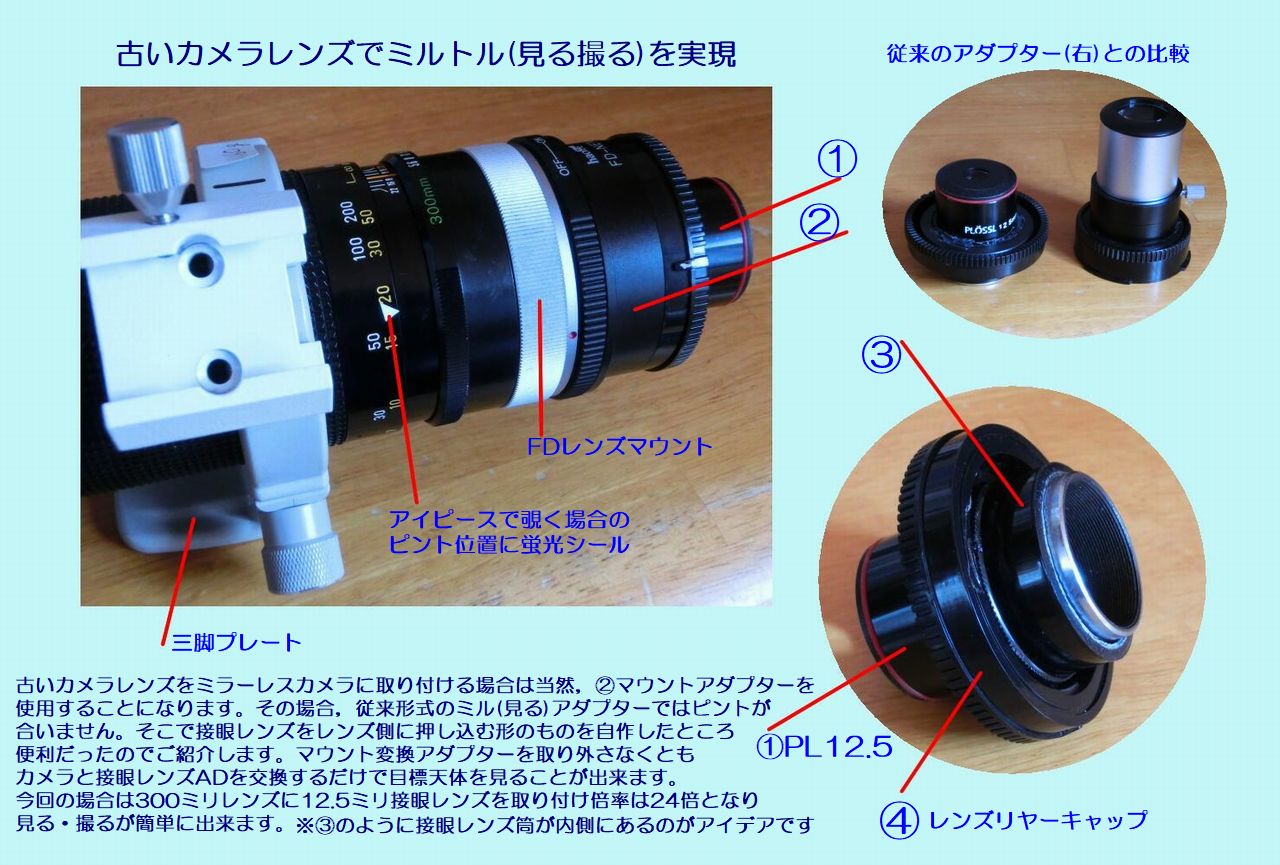 昨年アルビレオ計画という設定でミニ望遠鏡を数台作り,ミニ望遠鏡の最低限の性能としてアルビレオを分離できる ことを目標にしました。結果として15倍以上あれば口径によらず分離することが分かりました。書物によると7*50双眼鏡でも 分離すると書いているのもありますが,自分自身では10*50双眼鏡では無理で,15*45IS双眼鏡で確実に分離しました。 その昔,双眼鏡のレンズで自作していた18*50(元は60mm)単眼鏡ではいとも簡単に分離し色も綺麗だったので20*50が お気楽望遠鏡のスペックと決めました。思い出すとその昔,タカハシに20*50双眼鏡というのがあり,M天体を沢山見ることが 出来ました。すでに答えはあったわけです。問題は対物レンズの入手です・・今どき自作パーツを販売しているところは少ない ですから・・・ふっと思いつきました。写真用のクローズアップレンズなら短焦点もあるじゃないかと。アクロマートタイプも ケンコーだけでなくキヤノンやニコンにもあり数も出回っているしgood!! 次に接眼レンズをどうするか?シングルレンズと 組み合わせるなら2枚玉のルーペがよさそう,性能はピンキリだけど・・アクロマート対物にはKかPLタイプを付けている。 |