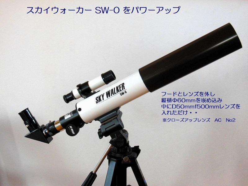 SKY WALKER SW-0 には,分離式D50ミリ・焦点距離360ミリのアクロマートレンズが入ってます。しかし,絞りによって有効口径32ミリになってしまって,残念なことに星雲や星団が殆ど見えません・・暗い・・・そこで,対物レンズをクローズアップレンズ(52ミリサイズ,アクロマートNo2)に交換しました。縦樋がひったりサイズで改造は非常に簡単です。 |